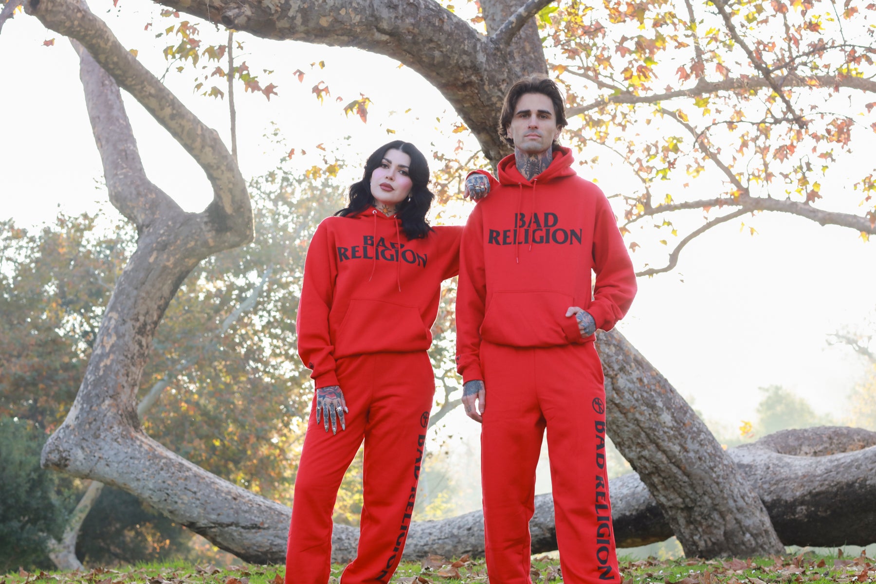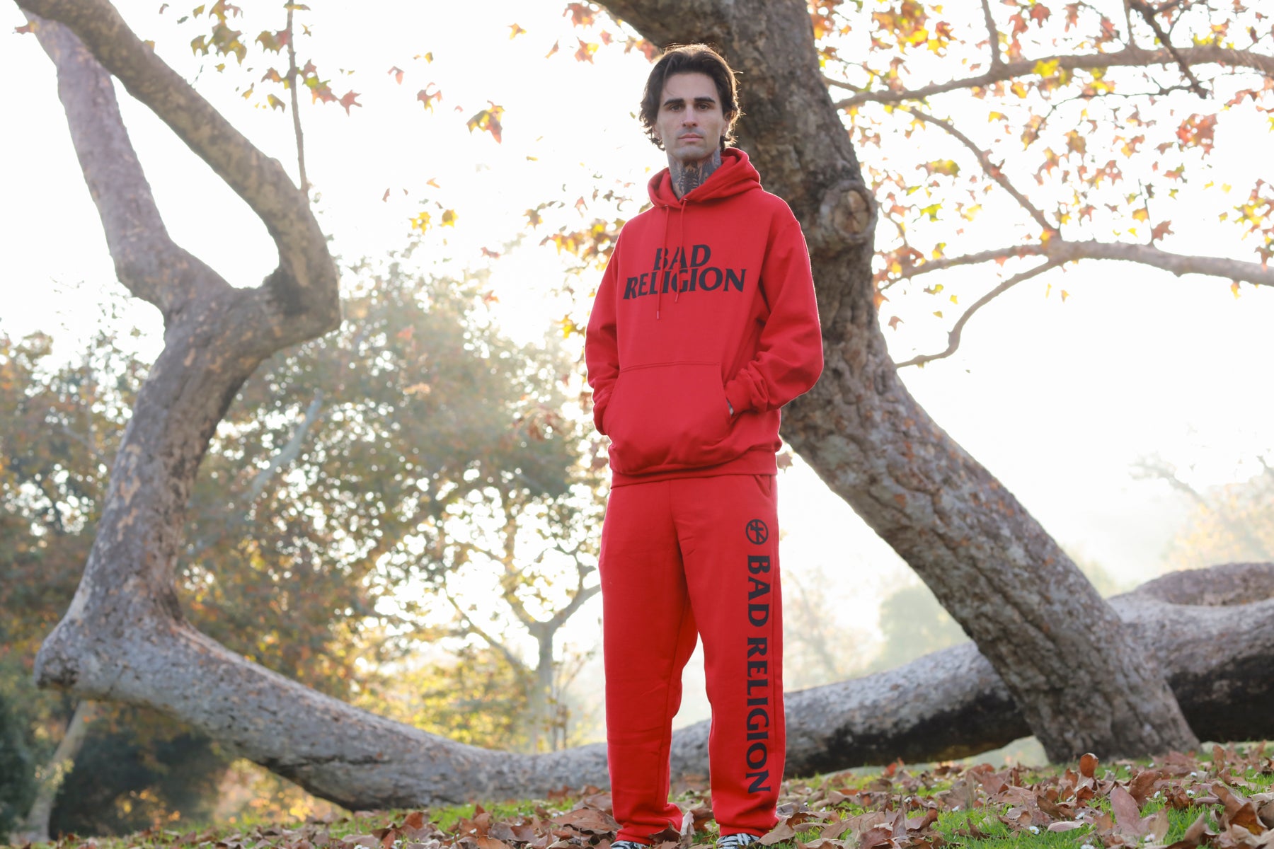The Bad Religion Logo design, printed on a red pullover hoodie with the Crossbuster logo on the sleeve.